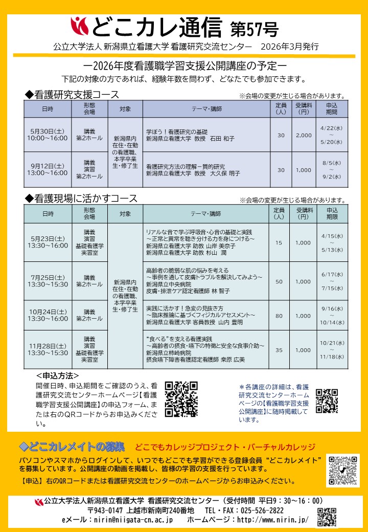 ー2026年度看護職学習支援公開講座の予定ー ご覧の対象の方であれば、経験年数を問わず、どなたでも参加できます。 ぜひご参加ください。 また、どこカレメイトも募集しています!! ご応募お待ちしております。